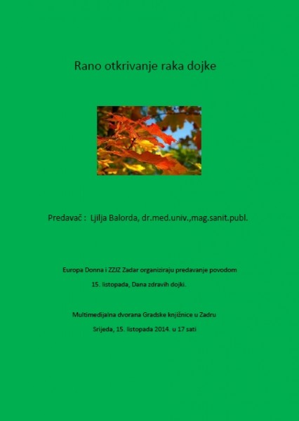 Europa Donna i ZZJZ Zadar organiziraju predavanje povodom 15. listopada, Dana zdravih dojki. Predavanje pod nazivom "Rano otkrivanje raka dojke" održat će se u multimedijalnoj dvorani Gradske knjižnice u Zadru u srijedu 15. listopada 2014. u 17 sati. Predavanje će održati koordinatorica Programa ranog otkrivanja raka dojke za Zadarsku županiju liječnica Ljilja Balorda, specijalistica javnog zdravstva iz Službe za socijalnu medicinu i javno zdravstvo Zavoda za javno zdravstvo Zadar.
