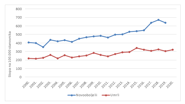 Slika 1. Gruba stopa novooboljelih i umrlih od raka (C00-C97, MKB-10) u Zadarskoj županiji od 2000.-2020. godine